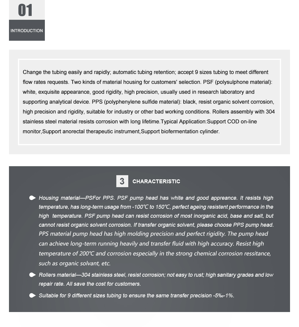 Change the tubing easily and rapidly; automatic tubing retention; accept 2 sizes tubing to meet different flow rates requests. Two kinds of material housing for customers‘ selection. Rollers assembly with 304 stainless steel material resists corrosion wit Industry application