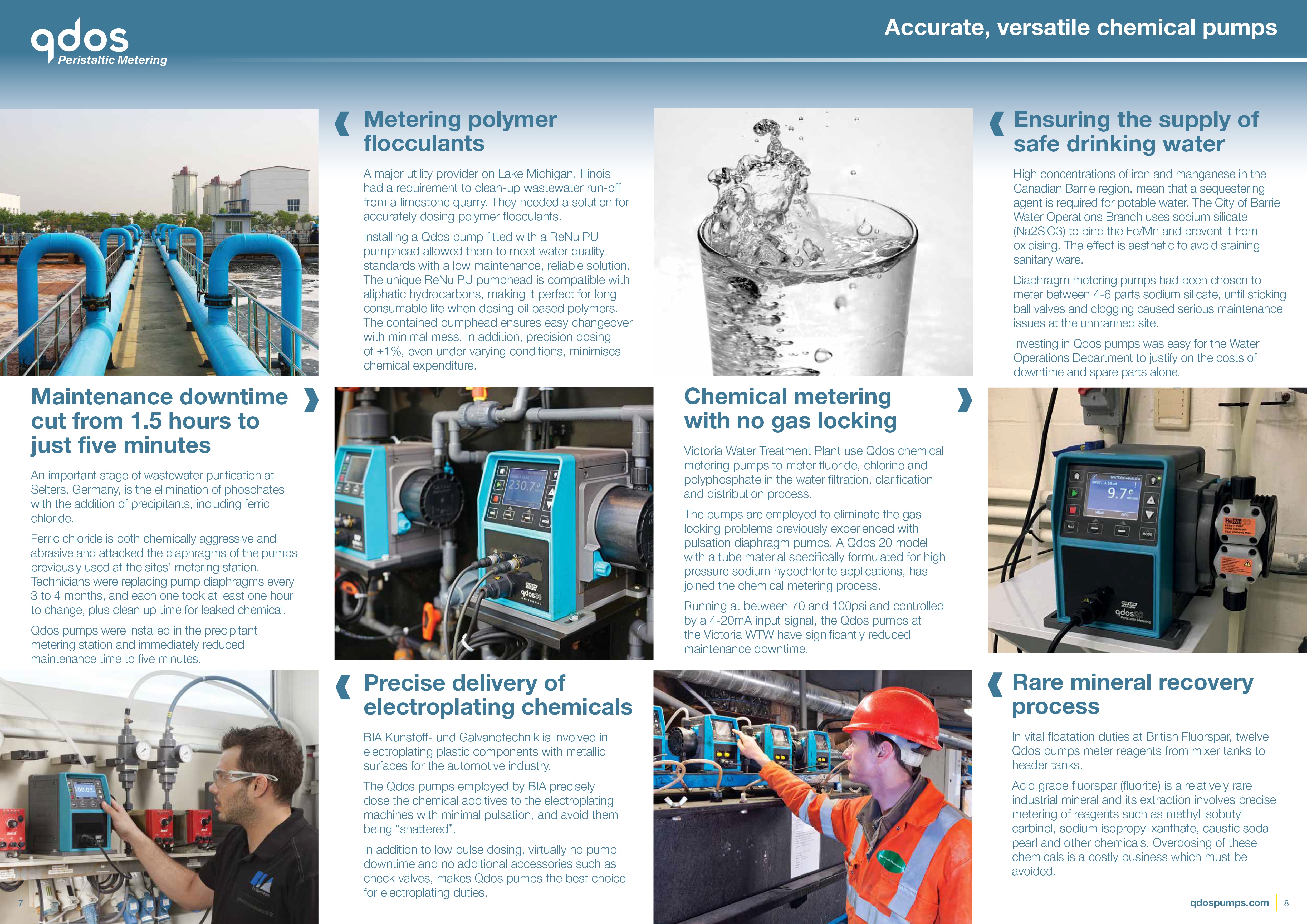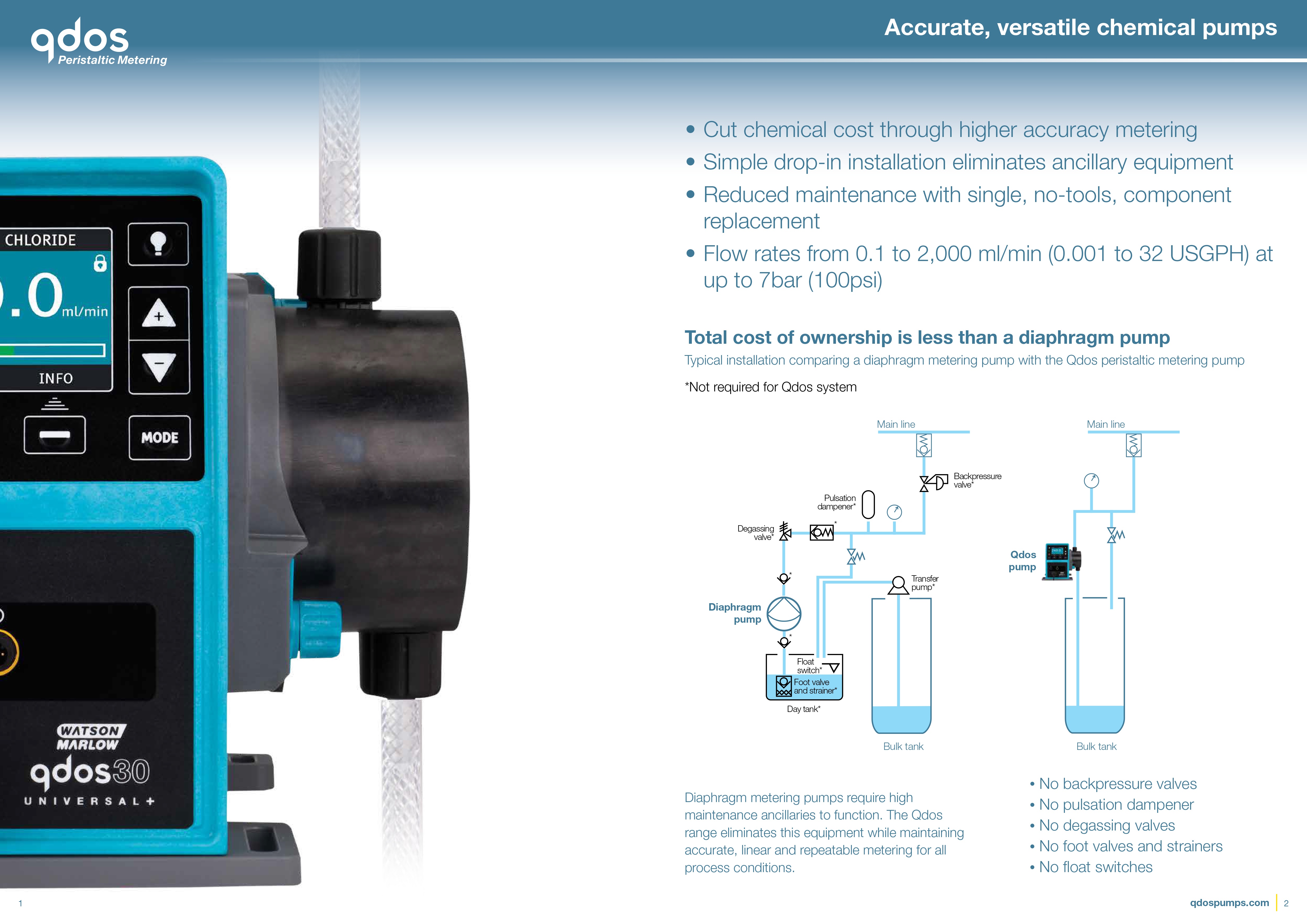 Delivering flow rates that remain constant right up to 7 bar Qdos peristaltic chemical metering pumps give users a unique advantage over diaphragm metering pumps.