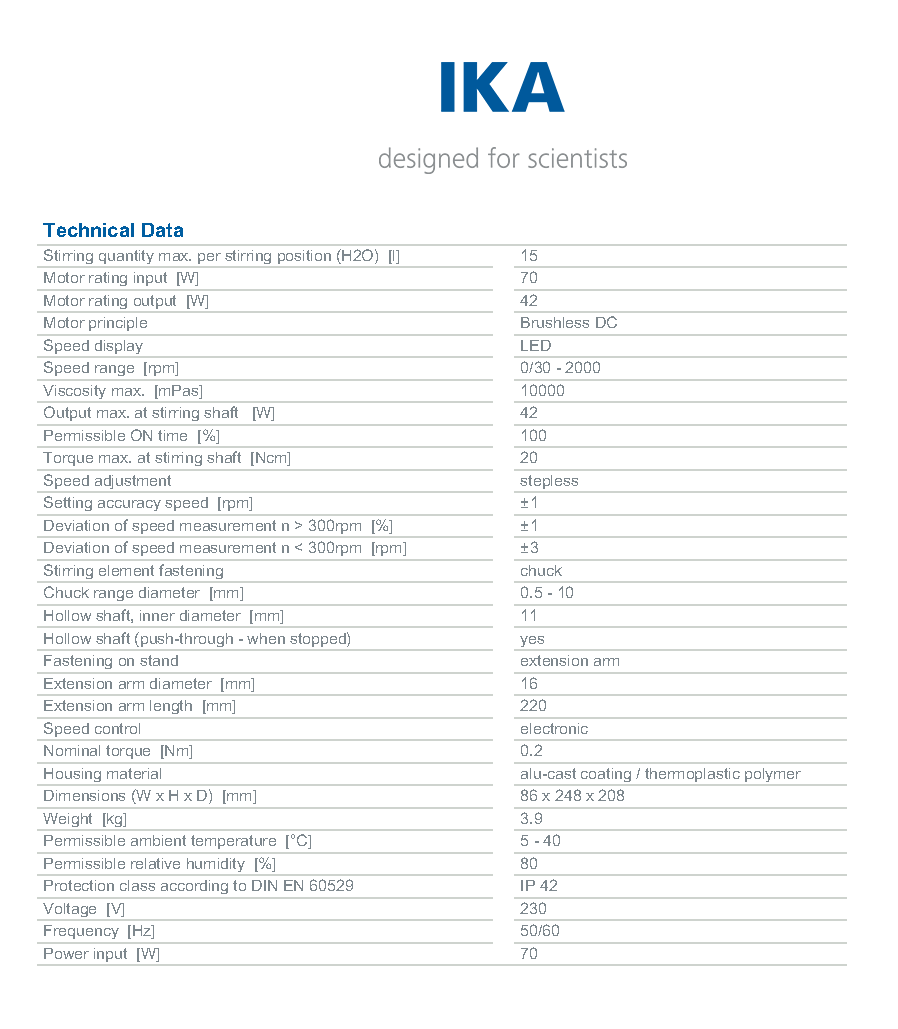 Laboratory stirrer designed for simple stirring tasks for quantities up to 15 l (H2O). It automatically adjusts the speed through microprocessor controlled technology within the speed range of 0/30 - 2000 rpm. Safety circuits installed ensures automatic cut-off in an anti-stall or overload conditions. Continuous comparison of shaft speed to desired speed is maintained and variations are adjusted automatically. This guarantees a constant speed even with changes in viscosities of the sample.